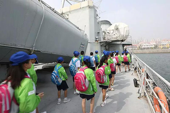 迎着16日撒向海面的金色朝阳,同学们迫不及待地登上了“合肥号”导弹驱逐舰。