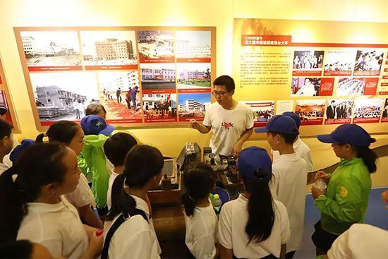 ▲ 认真聆听大学生志愿者讲解校史