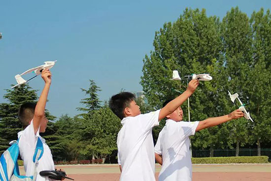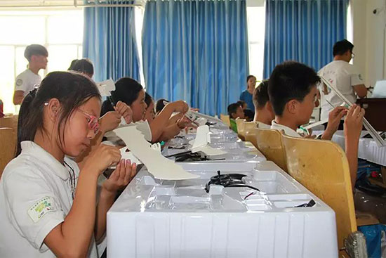 18日上午,同学们在大学生志愿者的指导下,亲手制作了自己的“第一架飞机”。