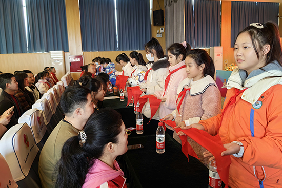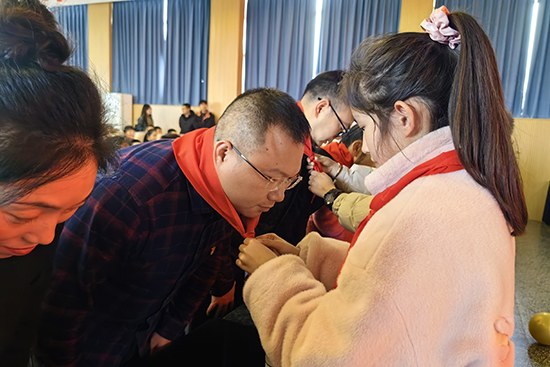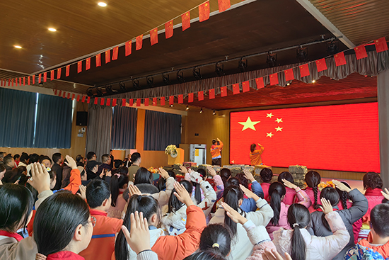下午,“国珍书屋”授牌仪式正式开始。少先队员为嘉宾佩戴红领巾。全体人员共同参加了升旗仪式。