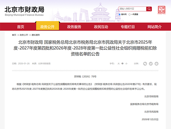 1月22日,北京市财政局、国家税务总局北京市税务局、北京市民政局发布京财税〔2026〕78号公告,北京国珍爱心基金会获得2026年度-2028年度第一批公益性社会组织捐赠税前扣除资格。